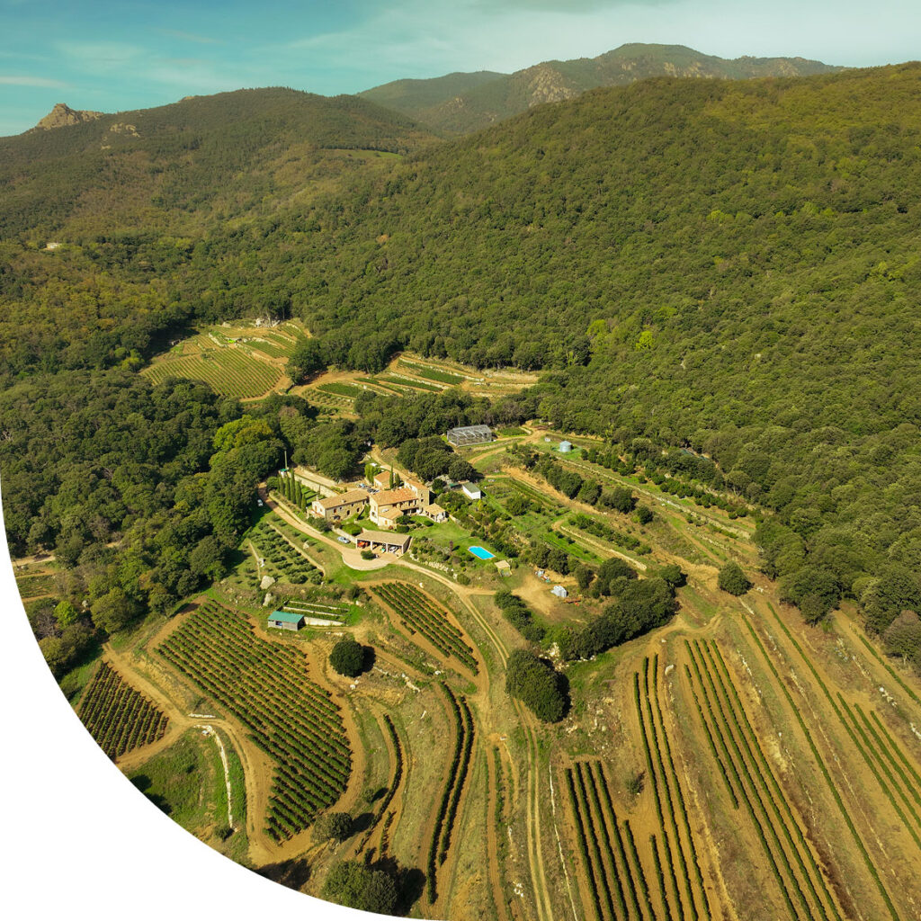 Situé en Catalogne, sur les communes de La Vajol et Agullana, à seulement 8 kilomètres de La Jonquera, le domaine s’étend sur près de 200 hectares, entre 500 et 900 mètres d’altitude, aux portes de la frontière française. Ce vaste territoire est essentiellement couvert de chêne vert, chêne rouvre, chêne-liège et châtaigniers, formant un environnement naturel préservé et authentique. Le domaine se compose de deux entités attenantes, Can Quera et Can Comaulis, dont les bâtisses, entièrement construites en pierre granitique, sont typiques de l’architecture locale. Dans la demeure principale, certains linteaux attestent de constructions datant de 1644, laissant supposer une histoire encore plus ancienne.